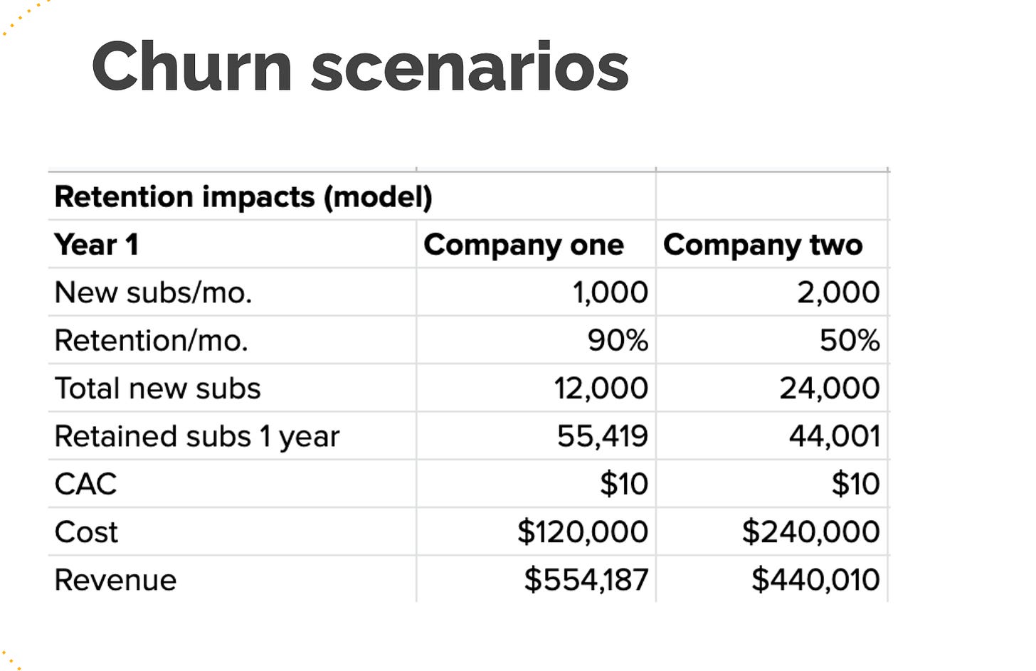 -- Company Two: 2,000 new subs/mo. with 50% monthly retention → 44,001 subscribers retained after 12 months → $440,010 revenue.